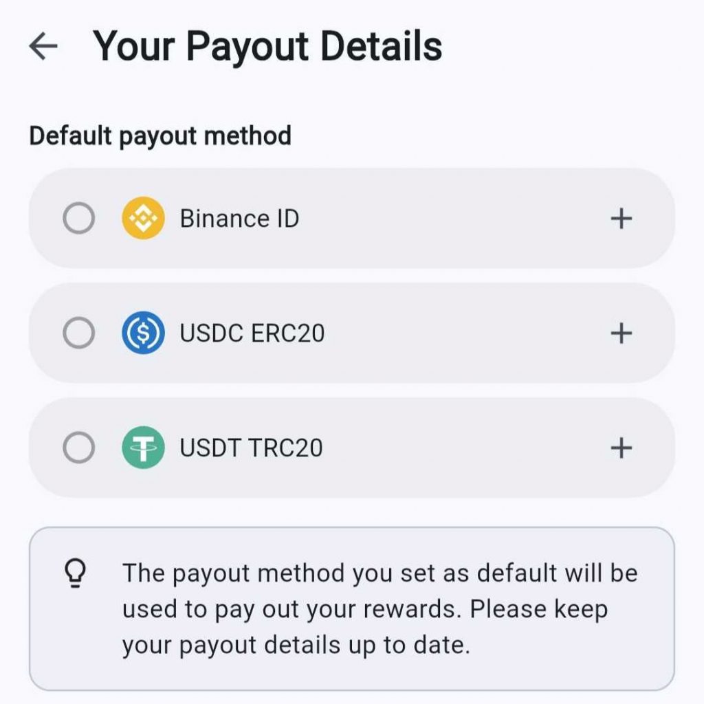 Mangyaring tandaan: Palaging i-double check ang iyong wallet address. Awtomatikong ginagawa ang mga pagbabayad, at ang mga maling detalye ng wallet ay maaaring humantong sa hindi maibabalik na pagkawala ng mga pondo.